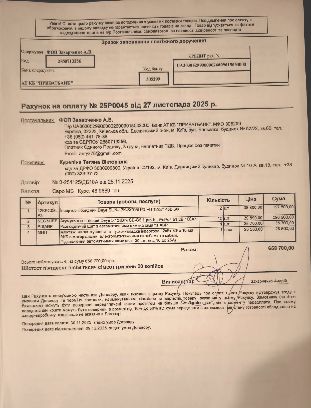 Безпосереднє встановлення інвертора та підключення до електромережі будинку відповідно до технічного завдання. Заплановано на 8.12.2025.